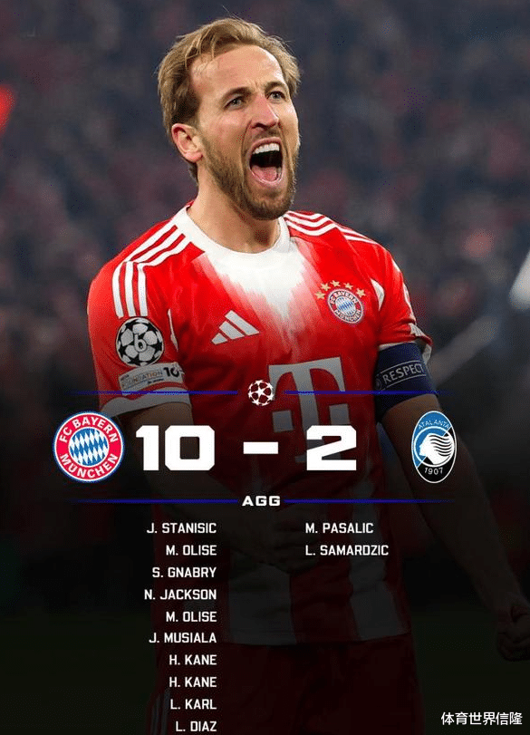 拜仁4-1亚特兰大,累计射门进球情况10-2,拜仁进入下一轮
