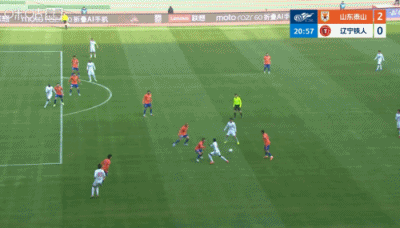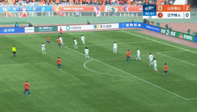 第34分钟,山东泰山左路策略 底线球,皮球斜传进危险区域 ,高准翼的顶球攻门高出了古代足球 门 ↓